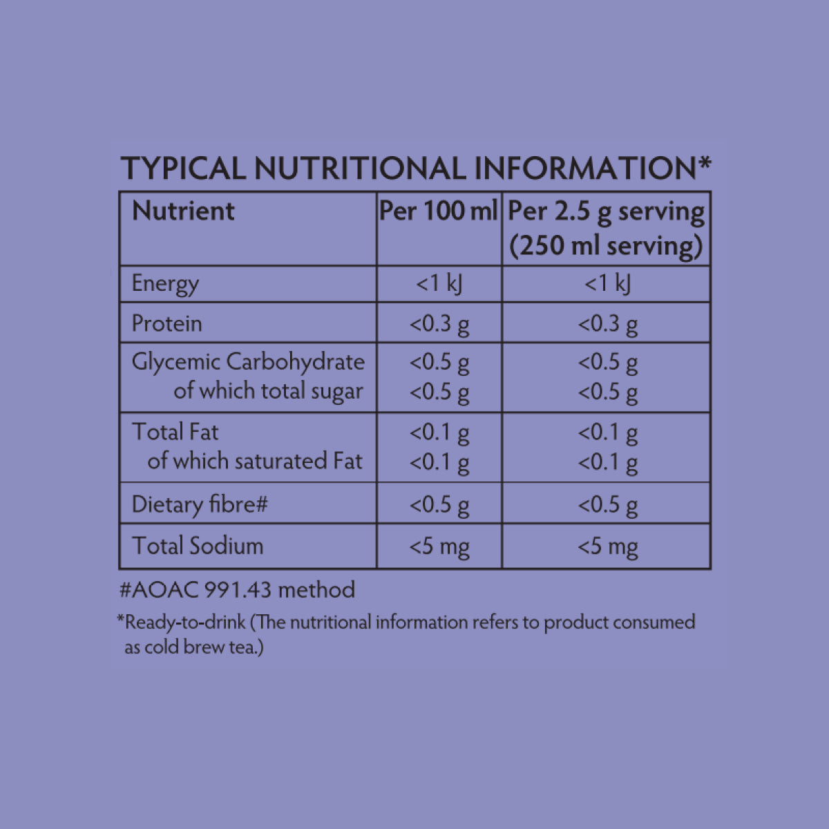 Preparation instructions: use 1 teabag for every 250ml cold or room temperature water using a jug, water bottle or travel cup. Steep for 10 min to max 30 min. Stir or shake in between. Remove teabags. Enjoy with or without ice. Refrigerate and use within 24 hours. Optional serving suggestions: Add fruit juice or honey/sugar if a sweeter ice tea is preferred.