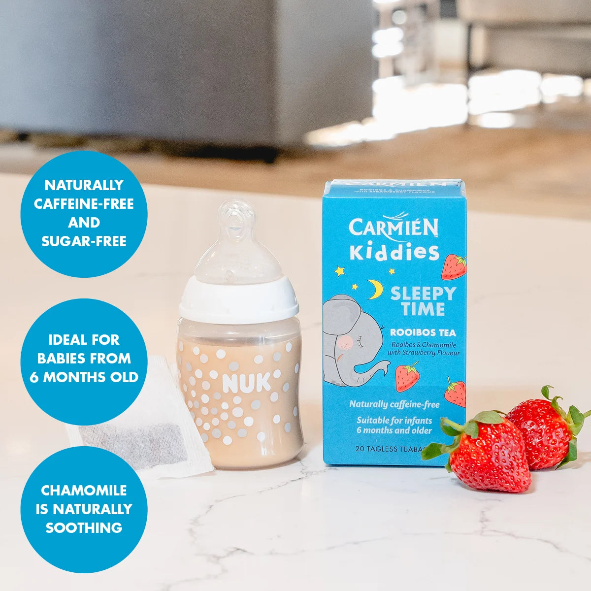 Kiddies Sleepy Time is a specially formulated blend of rooibos and chamomile to ensure a good night’s sleep.